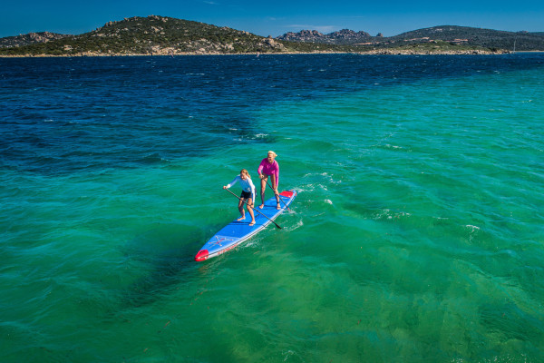Dieses aufblasbare Team-Board für zwei bis drei Personen ist ein Riesenspaß und Trainingsgerät zugleich, denn es gleitet außerordentlich schnell. Zum einen sind Teamqualitäten gefragt um die Paddelschläge zu synchronisieren, zum anderen entwickelt sich ein echter Speedfaktor wenn man im Einklang mit dem Partner und der Natur über den See oder das Meer gleitet. Denn die langgezogene, parallele Outline kombiniert die Geschwindigkeit eines Raceboards mit der Kippstabilität eines Touringboards. Beschleunigt wird es auch durch die Kante am Heck, die für den Wasserabriss sorgt, die sog. Railedge Technology. Das SUP-Erlebnis teilen, sich unterhalten während der Tour, gegenseitig unterstützen beim Training, Kinder mitnehmen - das alles wird einfacher mit dem Tandem Board.