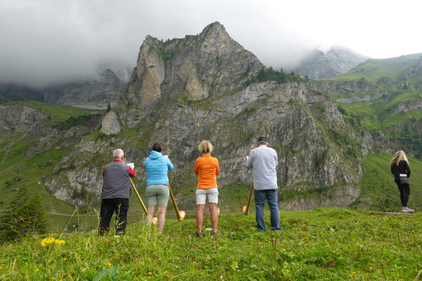 Die ersten Übungen für das Alphorn machen wir bereits unterwegs. Auf der Bannalp hast du dann genügend Zeit, um die Grundkenntnisse auf deinem persönlichen Alphorn zu erlernen. Ich führe dich schrittweise an die Blastechnik heran und vermittle dir Hintergrundinformationen rund ums Alphorn. Am Schluss werdet ihr fähig sein, in der Gruppe eine einfache Melodie zu blasen. Die Bannalp bietet dazu mehrere Plätze mit einer schönen aussicht und einem verzaubernden Echo.