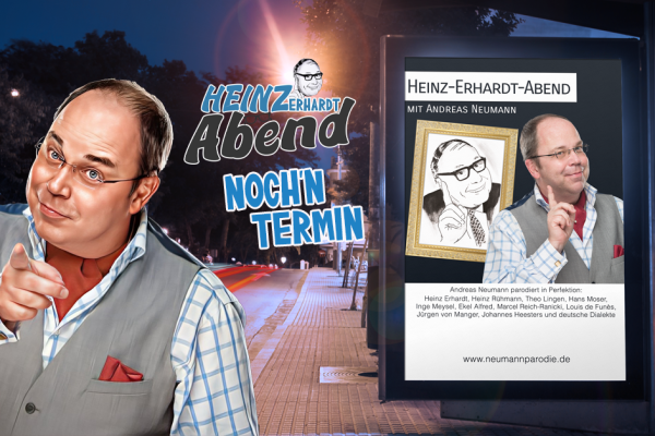 Andreas Neumann präsentiert seinen Heinz-Erhardt-AbendIn einer einzigartig gelungenen Weise lässt der Parodist Andreas Neumann die beliebten Komiker, Humoristen und Filmstars der Wirtschaftswunderjahre wieder auferstehen, und er macht das derart gekonnt, dass die Tochter von Heinz Erhardt, Grit Berthold, anerkennend bemerkte:,, Als ich Andreas Neumann hörte, meinte ich, mein Vater lebt wieder." Man glaubt an eine Inkarnation des 1979 verstorbenen Wirtschaftswunderkomikers! Laut Presse „Der beste Heinz Erhardt seit Heinz Erhardt“