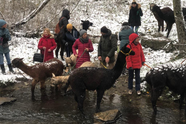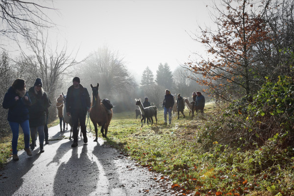 Nach einer kurzen Einweisung und Infos über die Tiere werden die Alpakas & Lamas auf die Tierführer verteilt. Natürlich dürfen die Begleitpersonen mit dem Tierführer sich auch abwechseln, wenn gewünscht. Nun geht es schon los. Auf unserer Tour geht es mal Bergauf, mal Bergab, aber auch viel auf geradem Wege. Es gibt ein Halt auf der "Alpaka Toilette" und mit späterer Rast an der Kall gibt es eine Badepause für die Tiere. In den Pausen gibt es Glühwein, Kinderpunsch & Snacks. Weiter geht es an Wiesen und Wäldern vorbei. So manches Tier kann man auf der Tour sehen. Die Ausblicke sind Lohnenswert.