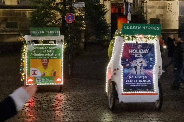 Wenn der Prinzipalmarkt in goldenem Glanz erstrahlt und der Duft von Tannengrün durch die Gassen zieht, beginnt in Münster die wohl schönste Zeit des Jahres. Mit den Leezen Heroes erlebt ihr diesen Zauber ganz exklusiv. In unseren weihnachtlich geschmückten Rikschas gleitet ihr wie in einem festlichen Schlitten zwischen den sechs Weihnachtsmärkten umher, hört Musik und genießt die beleuchtete Kulisse der Giebelhäuser.